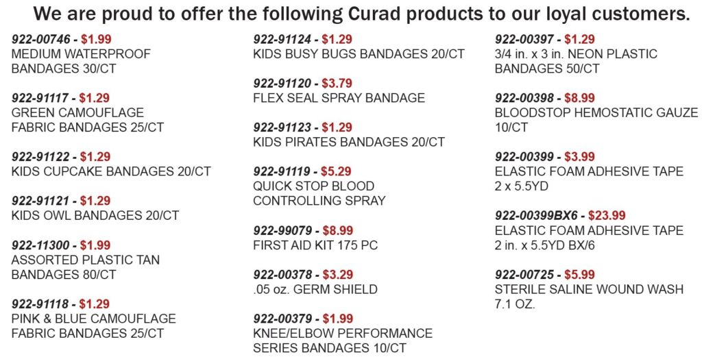 At E-FirstAid Supplies, we are proud to offer a new line of Curad first aid products to our valued customers. From innovative bandages to home first aid kits, Curad is a well known and trusted brand that provides hospital quality products for home use. We currently offer a wide variety of Curad products and bandages that can be useful in a multitude of situations. We have kids bandages, waterproof bandages, sport bandages, tape, spray bandages and more. And as an exclusive offer, for a limited time only we are rolling back pricing on all of our Curad Products! Don’t miss out on the chance to save big on high quality curad first aid items.