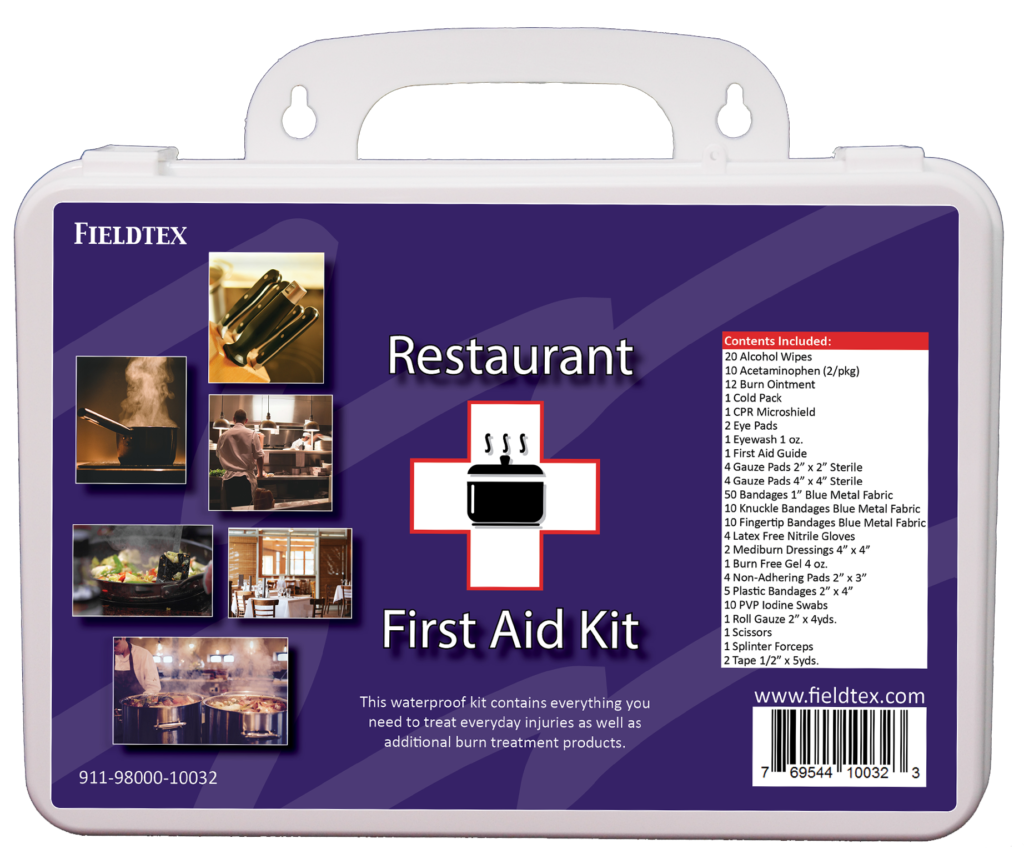 Restaurant Kit: Things move fast in a restaurant kitchen, and accidents are inevitable. Our Restaurant kit has everything you need to treat everyday injuries including additional burn treatment products. Our new and improved kit includes Blue Metal Bandages which allow you to easily find them if they have fallen off. This kit has everything you need to stay safe in the kitchen.