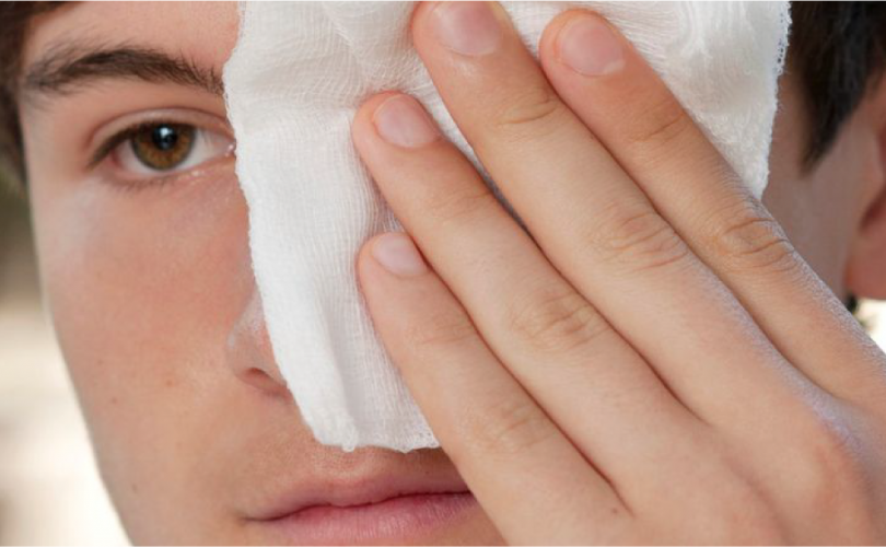The pad is secured by a stretchable bandage, ensuring it stays in place without causing discomfort or pressure on the injured eye. Sterility is maintained to prevent the introduction of bacteria to the wound, which is critical in reducing complications.